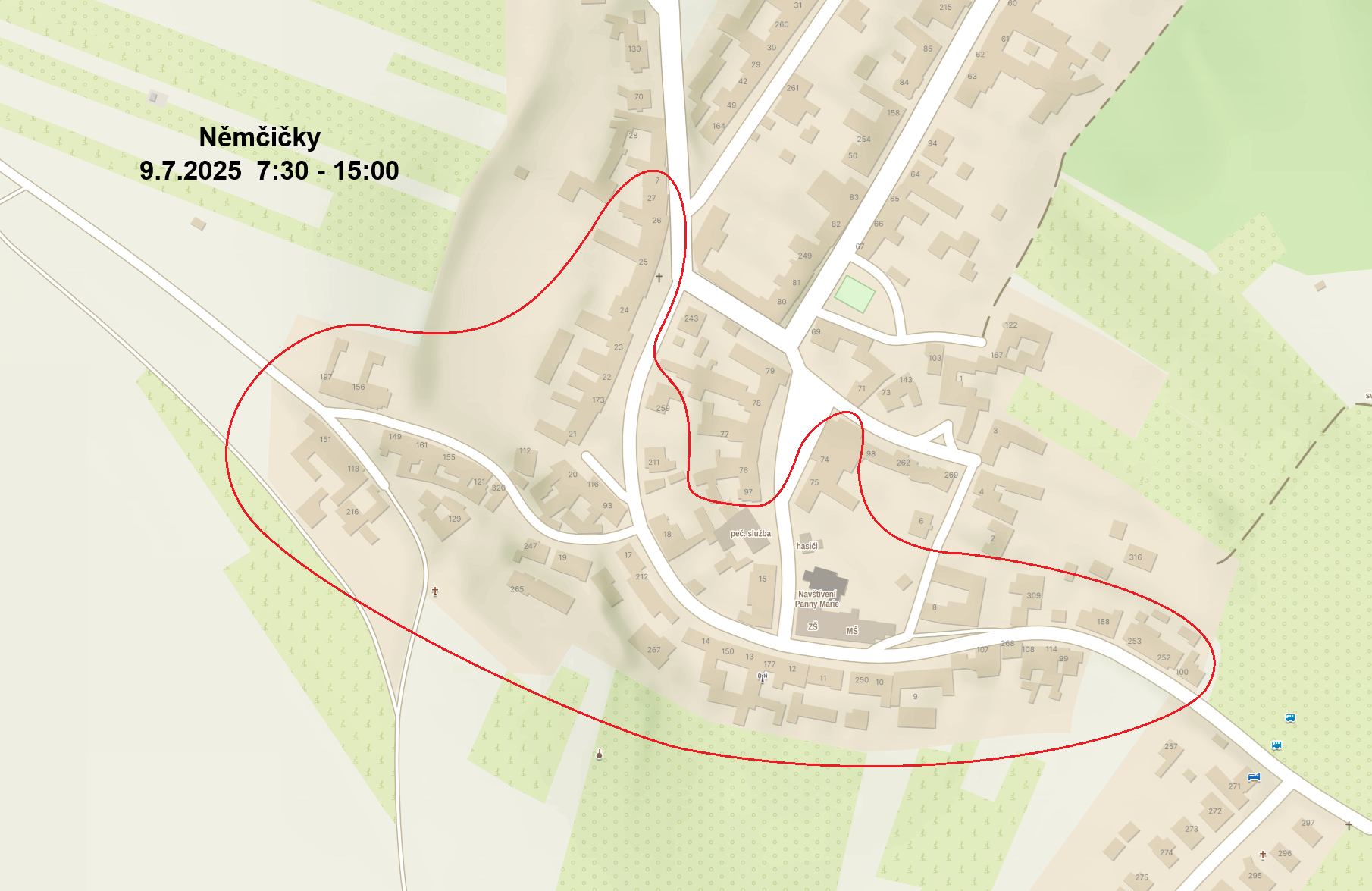 Němčičky u Hustopečí - ul. u kostela od č.p. 74 a 97 směr škola, - ul. u školy od č.p. 100 a 257 po č.p.