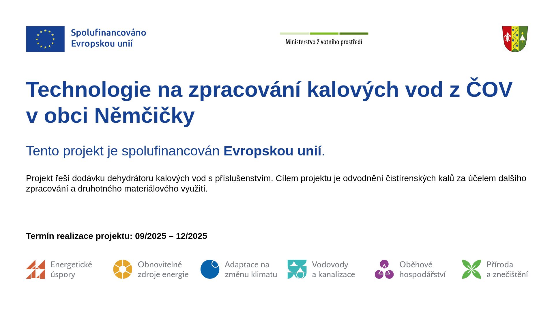Obec realizuje projekt „Technologie na zpracování kalových vod z ČOV v obci Němčičky“, který je spolufinancován Evropskou unií.